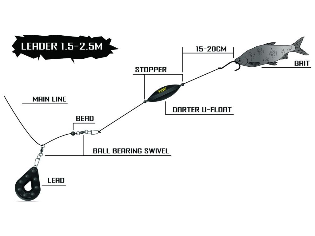 Bez jakýchkoliv zvuků, jako když vzduch protne vystřelený šíp, stojí podvodní splávek Darter U-Float téměř nenápadně v proudu a vytváří nejmenší proudové kanálky před nástrahou. Stefan Seuß vyvinul Darter U-Float speciálně pro silně prochytávané vody a rybářské situace, kdy sumci reagují velmi plaše a příliš hrubé a v proudu vibrující vzlínací tělíska ignorují. Podvodní splávek Darter U-Float je vytvarován jako konec šípu, slabá osa opatřena 4 kovexními (ven vyhnutými) křídly, která v silném proudu lámou tlak vody a nechají ji bez nápadného víření protékat tělem podvodního splávku. Křídla přitom fungují jako kýl, který nechá nástrahu v proudu dráždivě vlát sem a tam.
