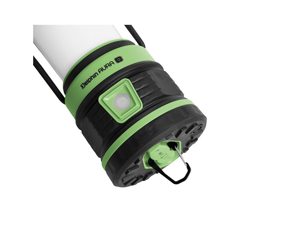 Nabízí 3 režimy svícení bílého světla, svícení červeným světlem (delší podržení tlačítka) a funkci světelného SOS (červeným světlem). Lucernu je možné položit na pevný povrch, díky pogumované podstavě je velmi stabilní. Kromě toho má ve vrchní a spodní části karabiny, a tak si ji můžete pověsit ve stanu či bivaku. Má masivní rukojeť, přenášení je velmi pohodlné a praktické. AURA má dokonce funkci "powerbanky", a tak si pomocí ní můžete dobít např. mobilní telefon. Lucerna se nabíjí pomocí přiloženého USB-C kabelu. Ten je možné vložit do voděodolného prostoru ve spodní části lampy, nehrozí tak jeho ztráta. Stejným kabelem pak můžete dobíjet zařízení s koncovkou USB-C. Tlačítko zapínání slouží i jako indikační dioda, díky které zjistíte stav nabití akumulátoru. Delphin AURA je dokonalým pomocníkem a vaším průvodcem ve tmě.