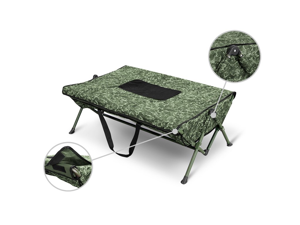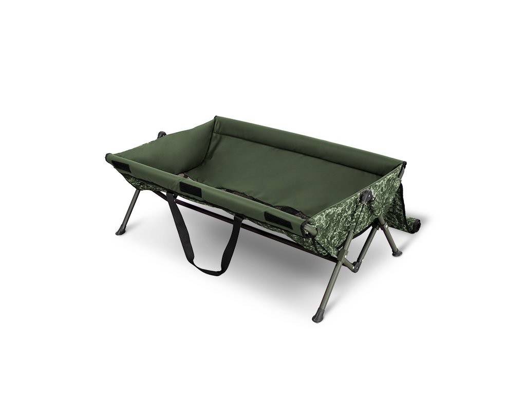 Konstrukce je vyhotovena z trubek o průměru 20mm, což zaručuje její stabilitu a odolnost vůči vnějším vlivům. Samotné lůžko je vyrobeno z pogumovaného materiálu, který nenasává vodu ani pachy. Kromě toho je takový materiál velmi rychle schnoucí a snadno omyvatelný. Ve spodní části kolébky je po celé délce jemná pogumovaná síťka, která je navíc pojištěna popruhy proti přetržení. Ve vrchní části kolébky se nachází pogumované látkové překrytí se síťovinovým průzorem. Toto překrytí je fixovatelné pomocí suchého zipu. Díky tomu vám úlovek nemůže z kolébky vyskočit při přípravě například na vážení či focení. Překrytí je navíc navrženo v patentovaném C2G vzoru, čímž vám Cradle bude dokonale ladit s jinými produkty z této jedinečné série. Kolébka je opatřena textilními madly pro usnadnění přenášení ve složeném stavu.