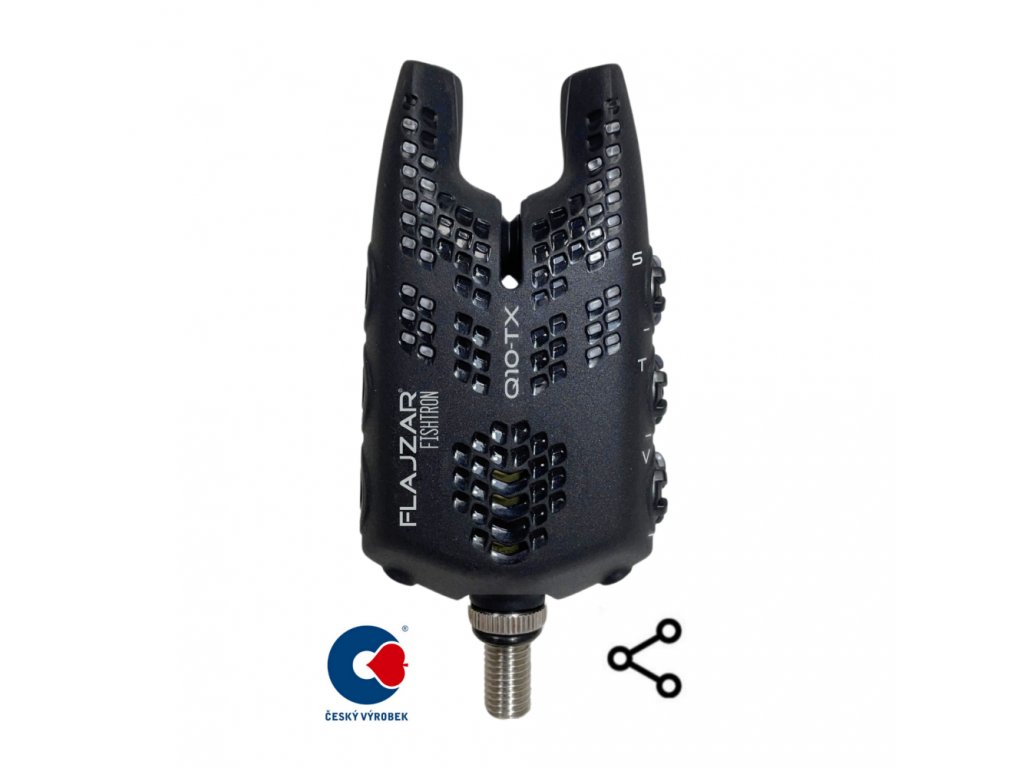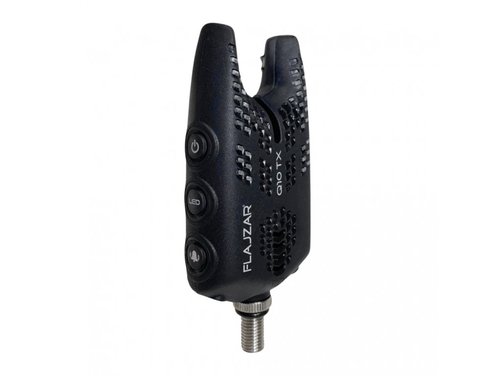 Tento zcela český signalizátor Q10 TX je nabitý novými funkcemi, jako jsou funkce CONNECT (kontrola dosahu s přijímačem RX MAX), funkce alarmu proti krádeži prutů, nebo funkce automatického zvýšení citlivosti. Potěší také další konektor pro swinger - nyní tak máte možnost si zapojit nejenom svítící swinger, ale i např. svítící uši. Vylepšením je také napájení dvěmi AAA bateriemi, což znamená, že výměna baterií je nyní snazší a efektivnější.