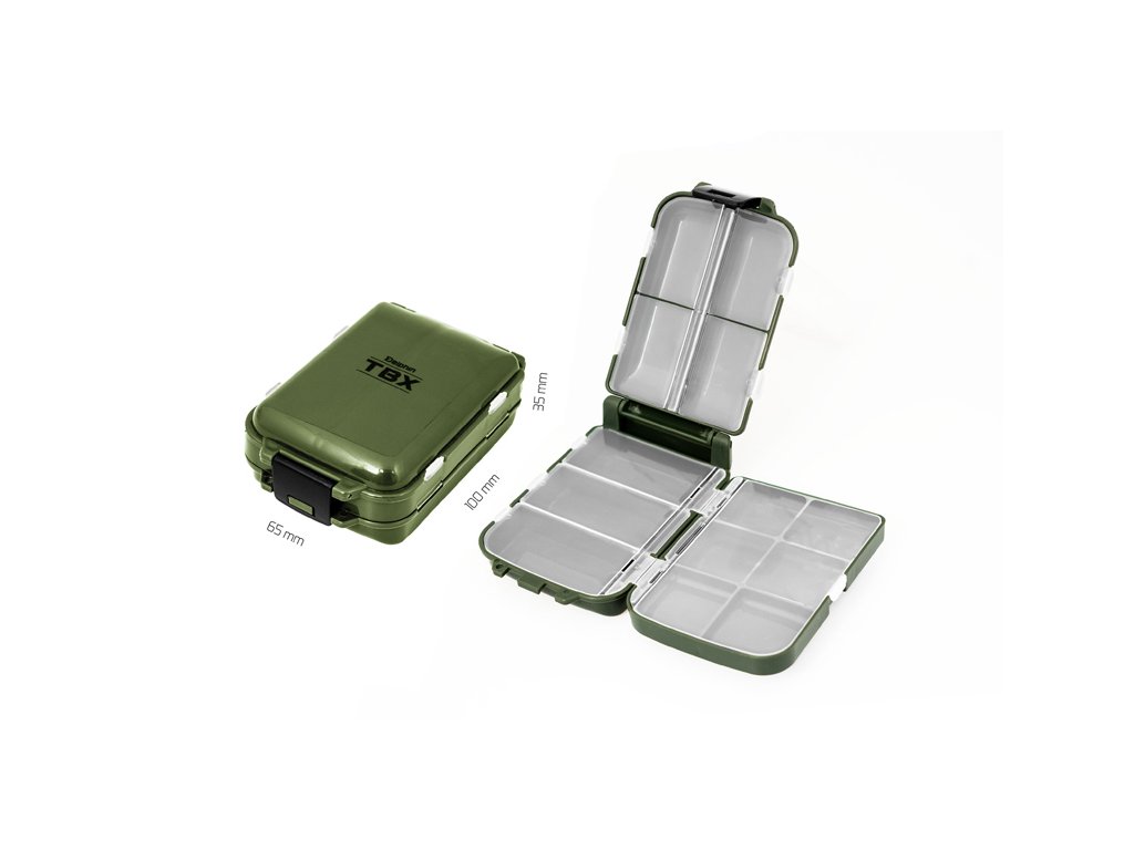 TBX Trio je multifunkčná krabička určená na uloženie rybárskeho príslušenstva. Vyrobená je z transparentného plastu, takže máte vždy prehľad o uložených veciach vo vnútri krabičky. TRIO znamená aj oddelené tri úložné priestory a to jeden z vrchnej časti, druhý zo spodnej a tretí v strede s dômyselným otváraním, vhodným na malé predmety ako háčiky, obratlíky a pod. Technické parametre: Rozmer: 100x65x35mm Počet pevných priehradiek: 13 Rozmer priehradky: 6x(2,5x2,5x0,5cm), 4x(2,5x4,2x1cm), 3x(2,7x5,7x1cm) Počet vkladateľných priečinkov: 0