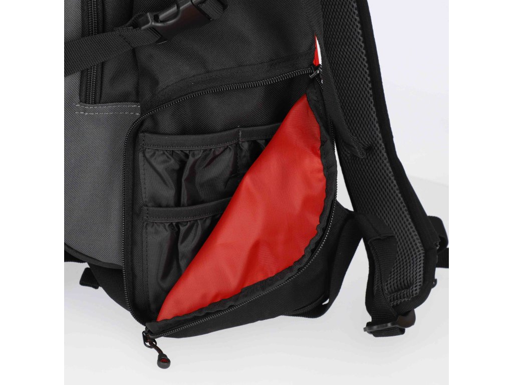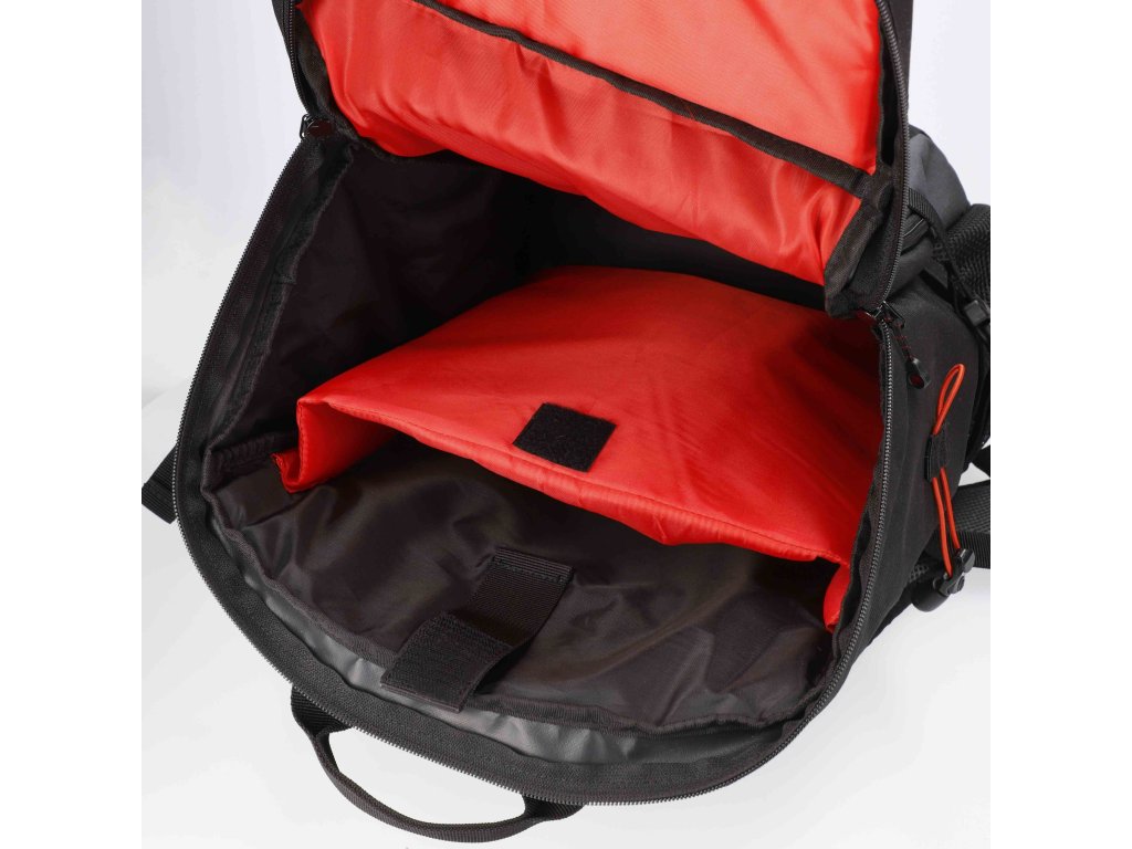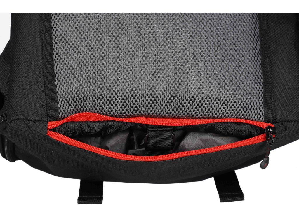 Četné kapsy a úchyty usnadňují organizaci a zvyšují kapacitu. Vybavený pláštěnkou.