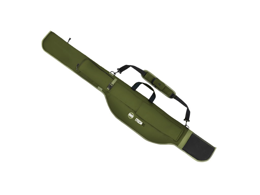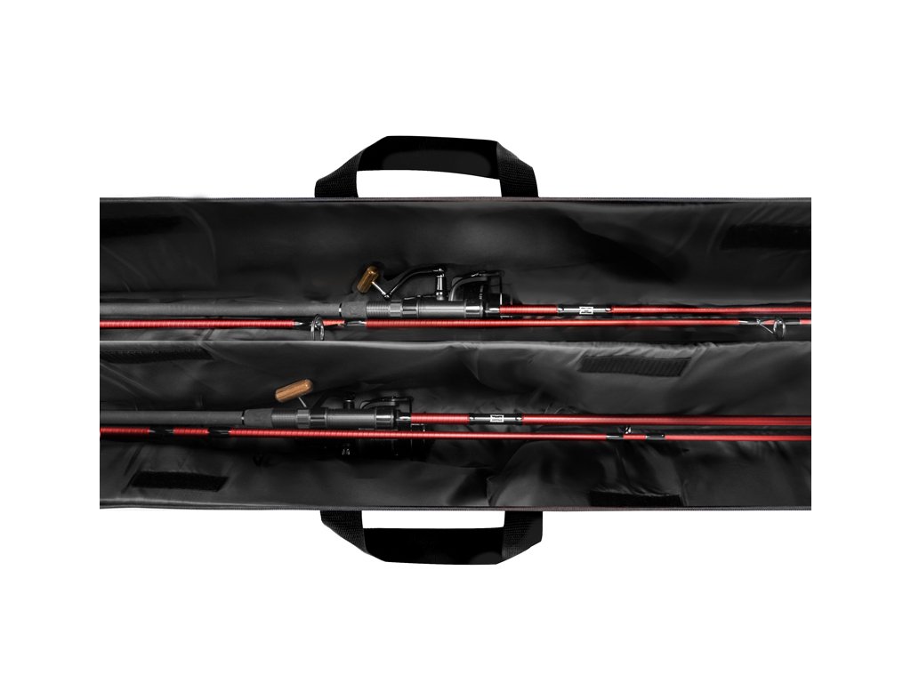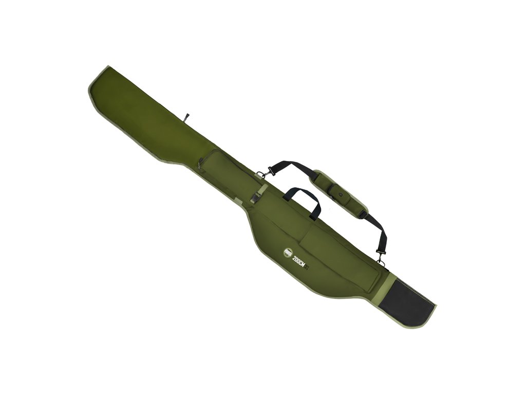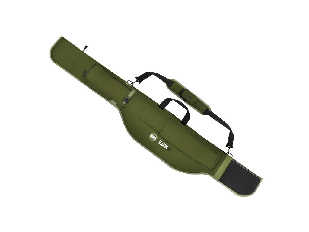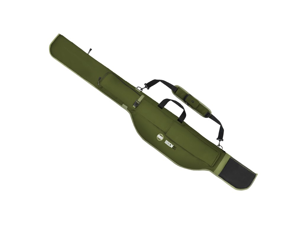 Pouzdro je navrženo v zelené barvě s černými doplňky a je vyrobeno z velmi odolné textilie, která bez problémů odolá slabšímu dešti či vlhkosti způsobené rosou. Ve spodní části je navíc odolný, nepromokavý materiál umožňující postavení pouzdra i na mokrou zem, aniž by došlo k jeho znehodnocení. Pouzdro je na všech stěnách včetně předělovací přepážky plně polstrované 6mm měkkou výstelkou. Tím pádem nehrozí při transportu 2 prutů jejich vzájemné poškození. Obě vnitřní komory na pruty jsou fixovatelné pomocí suchého zipu na jejich vrchu. Díky rozšířené části pro uložení navijáků se dovnitř vejdou všechny standardně používané kaprařské sestavy, přičemž jsme mysleli i na pruty s naváděcími očky o průměru 50 mm, pro které je v jednotlivých komorách dostatek prostoru.