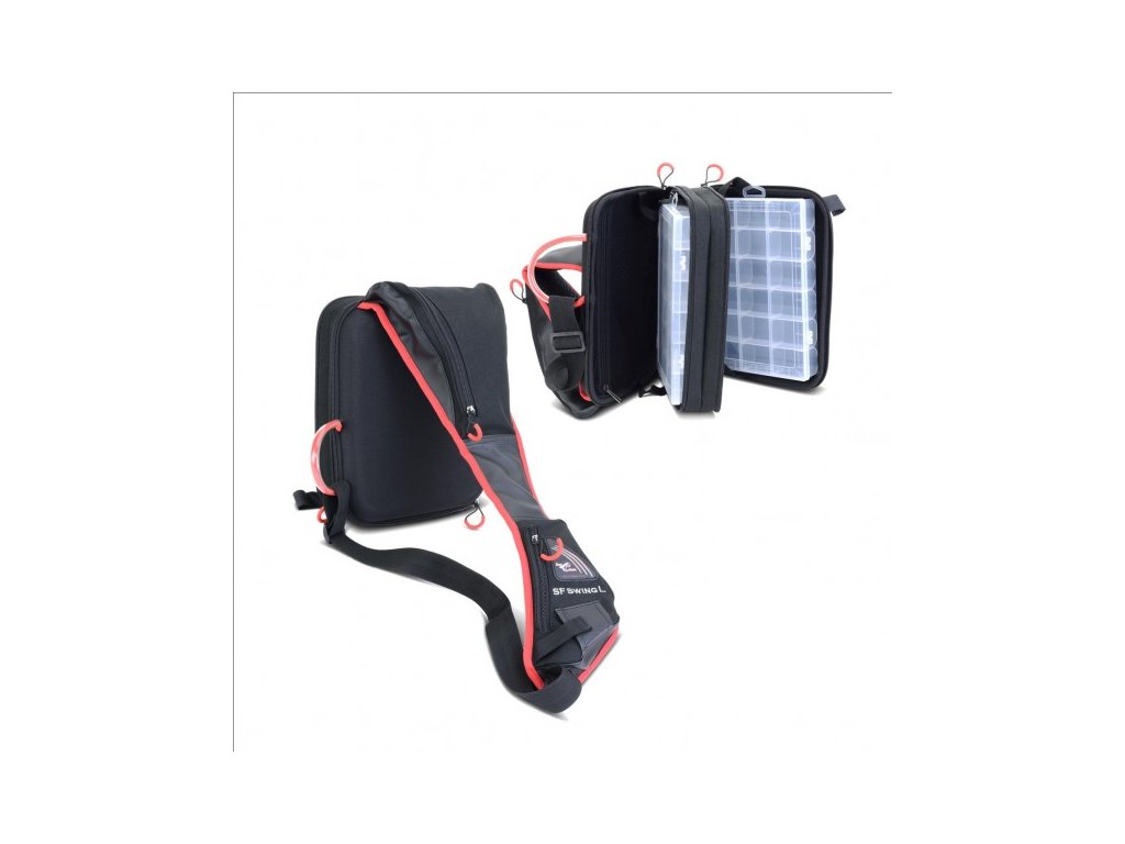 SF Swing L je určena pro výpravy na dlouhé vzdálenosti. Kromě dvou hlavních kapes na plastové boxy, které jsou zajištěny pomocí suchého zipu proti pádu, má taška 2 úložné prostory pro příslušenství a držák kleští na postroji. Všechny zipy jsou zakončeny extra silnými smyčkami, které umožňují snadné otevírání dokonce i v rukavicích nebo s mokrýma rukama. Taška je zavěšená v oblasti břicha, takže se do ní snadno dostaneme.