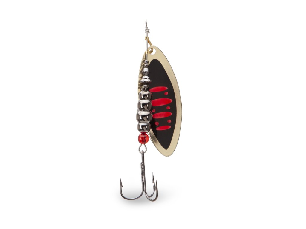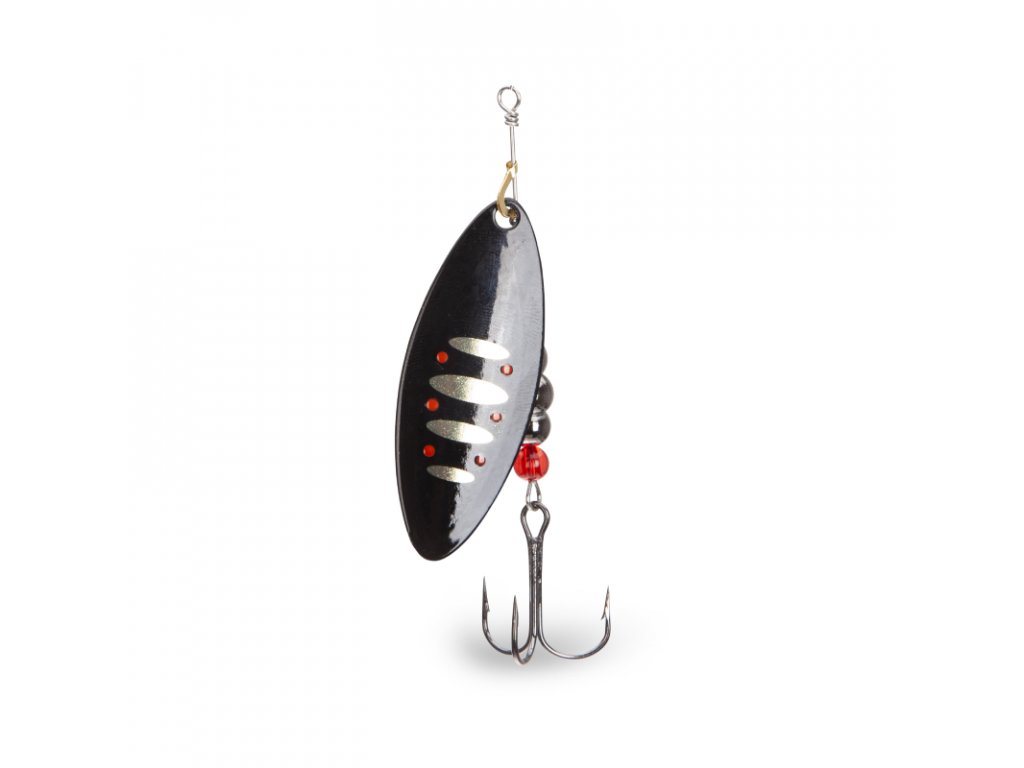 Klasická rotační třpytka spodlouhlým listem. Je vyrobena zkvalitního materiálu a doplněna kvalitními komponenty. Je osazena háčky Mustad. Lopatka má z každé strany jiný design.