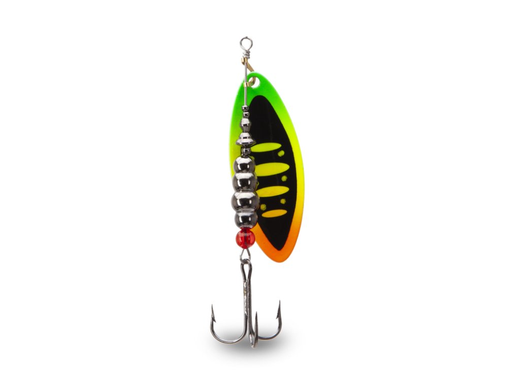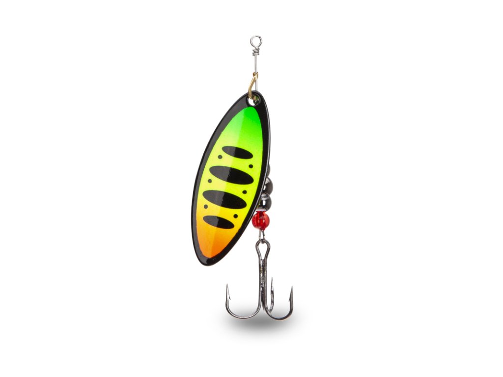 Klasická rotační třpytka s podlouhlým listem. Je vyrobena z kvalitního materiálu a doplněna kvalitními komponenty. Je osazena háčky Mustad. Lopatka má z každé strany jiný design.