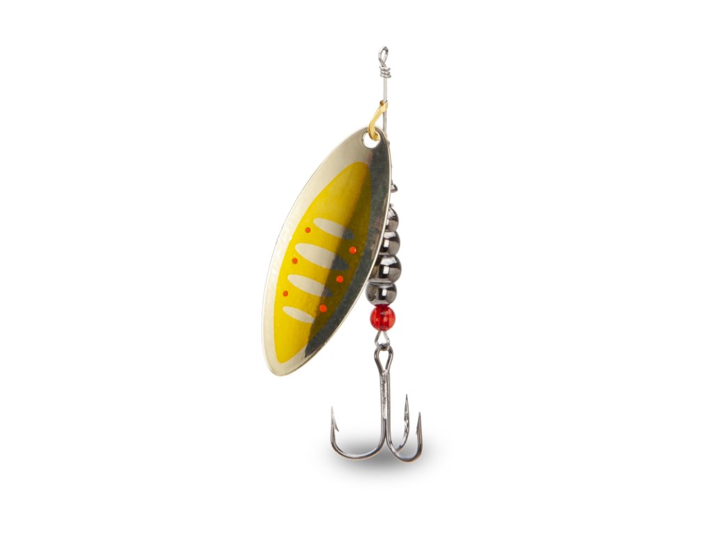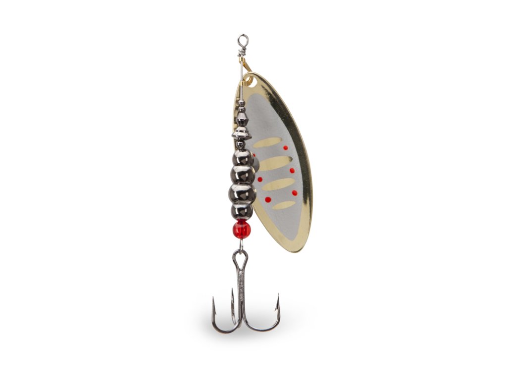 Klasická rotační třpytka s podlouhlým listem. Je vyrobena z kvalitního materiálu a doplněna kvalitními komponenty. Je osazena háčky Mustad. Lopatka má z každé strany jiný design.