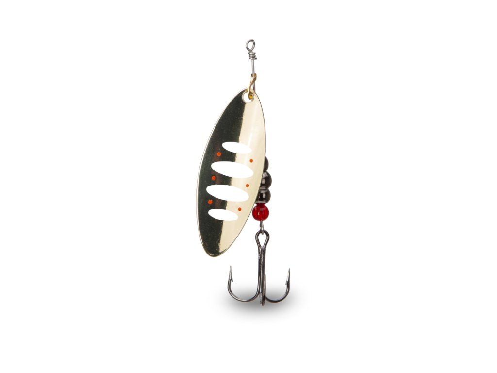 Klasická rotační třpytka s podlouhlým listem. Je vyrobena z kvalitního materiálu a doplněna kvalitními komponenty. Je osazena háčky Mustad. Lopatka má z každé strany jiný design.