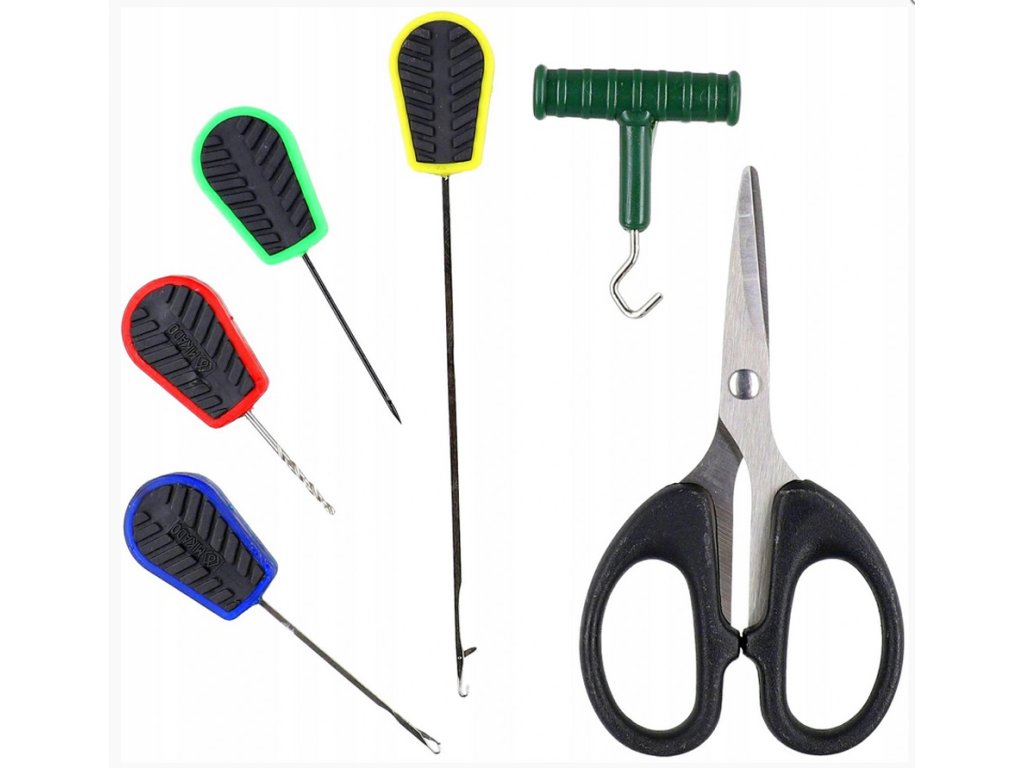 Neocenitelné při lovu kaprů. Sada návnadových jehel s nůžkami na šňůry a vazač uzlů a vrták na boilie nebo pelety.