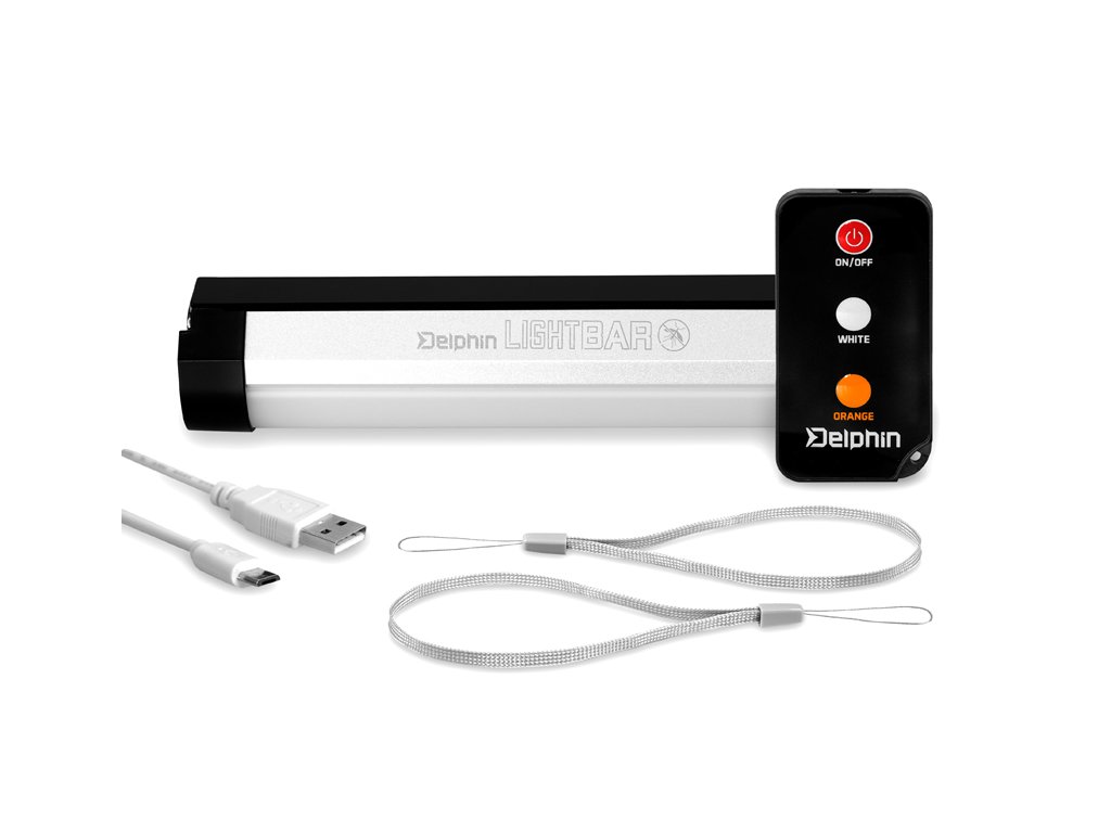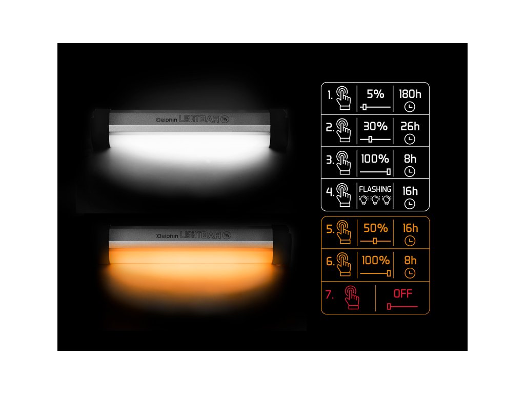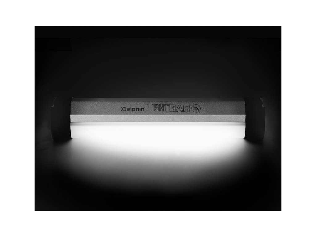 Delphin LightBAR je vysoce praktické bivakové světlo, díky němuž vás tma více nezaskočí. Disponuje dvěma barvami, přičemž každá z nich má několik úrovní svícení. Při prvním stisknutí se rozsvítí bílé světlo s 5% svítivostí. Druhým stiskem se rozsvítí na 30% a při třetím stlačení září bílé světlo na 100%. Při čtvrtém stisknutí se bílé světlo rozbliká, což oceníte například při vyvážce na velkých vodních plochách, kdy budete schopen jasně definovat, kde se na břehu nachází váš tábor. Pokud stačíte tlačítko 5x, změní se barva z bílé na oranžovou s 50% svítivostí. Při šestém stlačení se oranžové světlo rozsvítí na 100%.