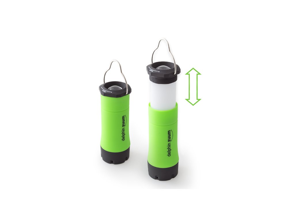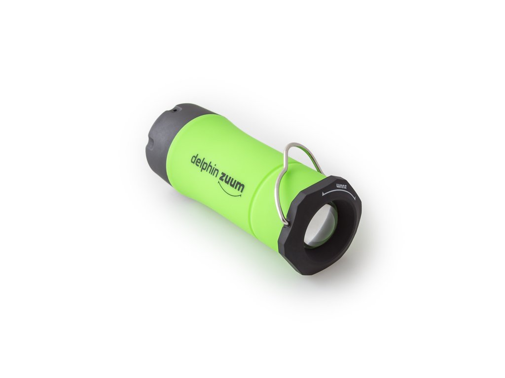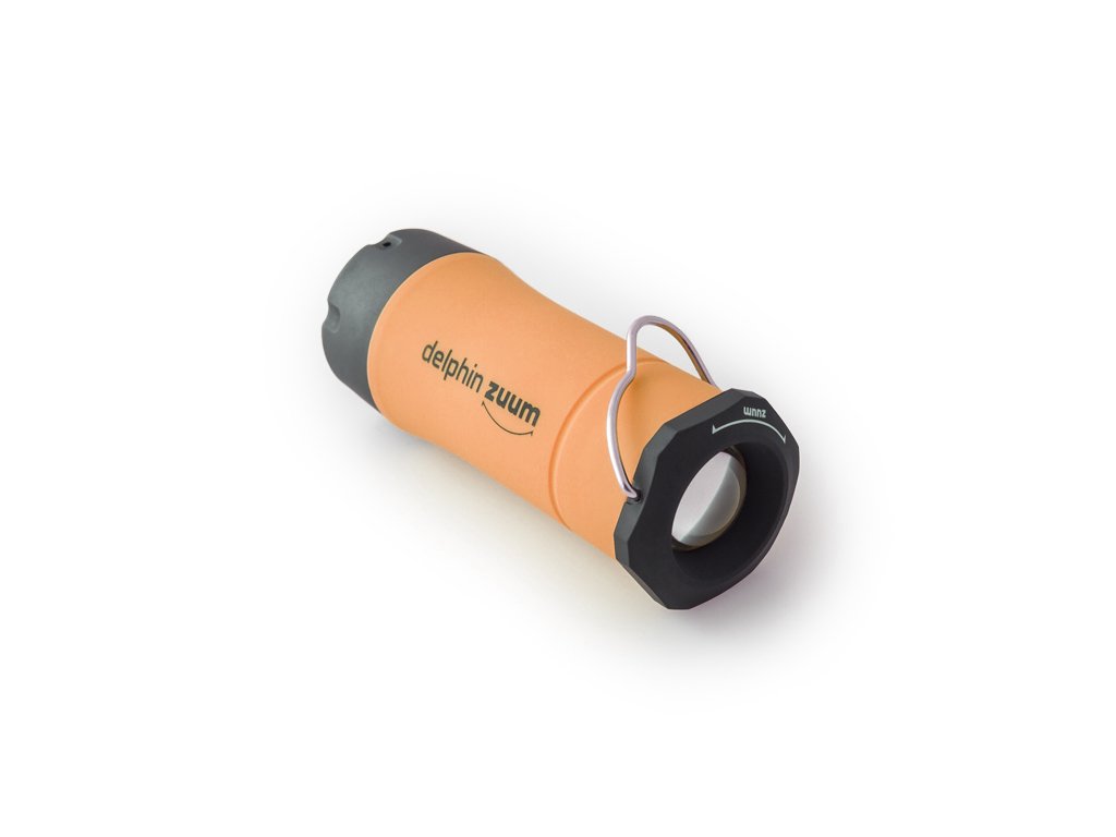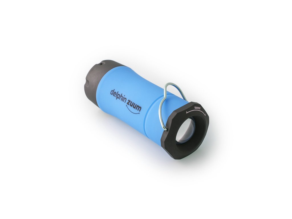 Příruční svítidlo, bez kterého se odteď neobejde žádná vaše vycházka k vodě. Delphin ZUUM je díky kompaktním rozměrům lehko přenosný a díky své multifunkčnosti přímo nenahraditelný společník za zhoršených světelných podmínek. Je ho možné použít jako klasické svítidlo do ruky, kdy světlo svítí přímým směrem z otočné hlavice. Pootočením je ale možné povytáhnout středovou část a udělat tak z baterky svítilnu. Tato svítilna sama stojí a navíc díky profilovanému drátěnému háčku ji můžete bez problémů i zavěsit. Tím ale výčet vlastností stále nekončí. Samotná LED dioda ve vnitřku má tři úrovně svícení: silné světlo, tlumené světlo a blikající stroboskop.
