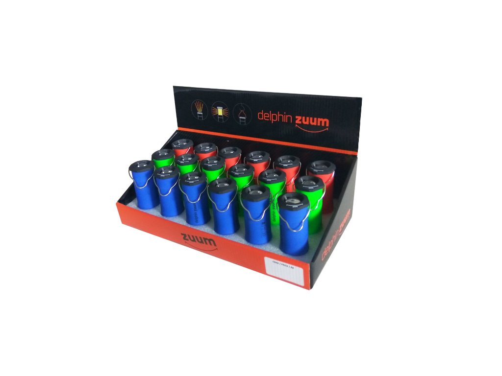 Svítidlo Delphin ZUUM je do prodejen dodávané v pultových plnobarevných prezentérech, přižemž každý obsahuje 18ks svítidla (6x zelené, 6x oranžové a 6x modré).