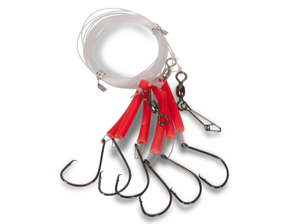 Pro větší atraktivitu je systém osazen fluoro převleky. Uprostřed systému je obratlík, který eliminuje možnost zamotání. Cílová ryba je okouník.
